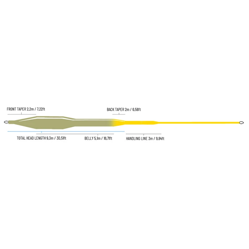 Een unieke taper en gewichtsverdeling, geconcentreerd op de eerste 5 meter van de 9,3 m lange kop, verhoogt de snelheid en kracht van de omzet naar het einde van de worp toe. Dit helpt om lange leaders om te draaien en ook om sterke tegenwind te bestrijden. Het duidelijke verloop aan de voorkant maakt de lijn ook zeer geschikt voor het werpen van streamers, zware nimfen, volumineuze dries, nimf rigs en “”klink & dink”” setups.