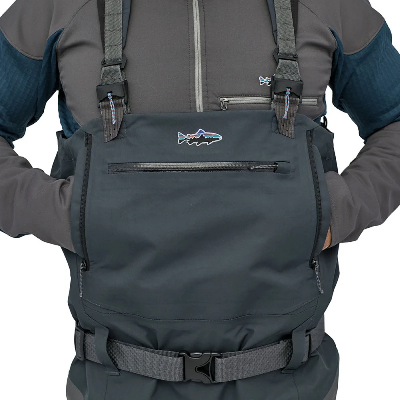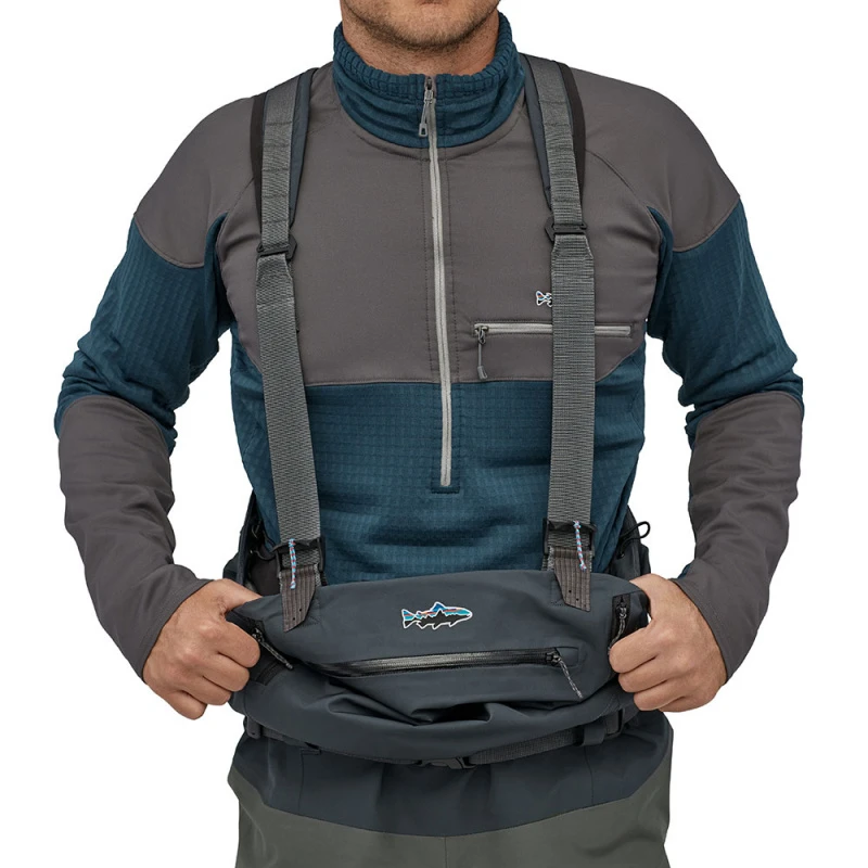 Volledig verstelbaar, quick-release jarretelsysteem voor een precieze en snelle overgang van borst- naar taillehoogte; aansnoerkoord bovenaan; Secure Stretch, no-snag waadriem; riemlussen voor en achter.